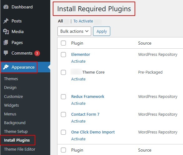 * * Alternatively, you can access the plugin install page from Appearance → Install Plugins in the WordPress admin menu.