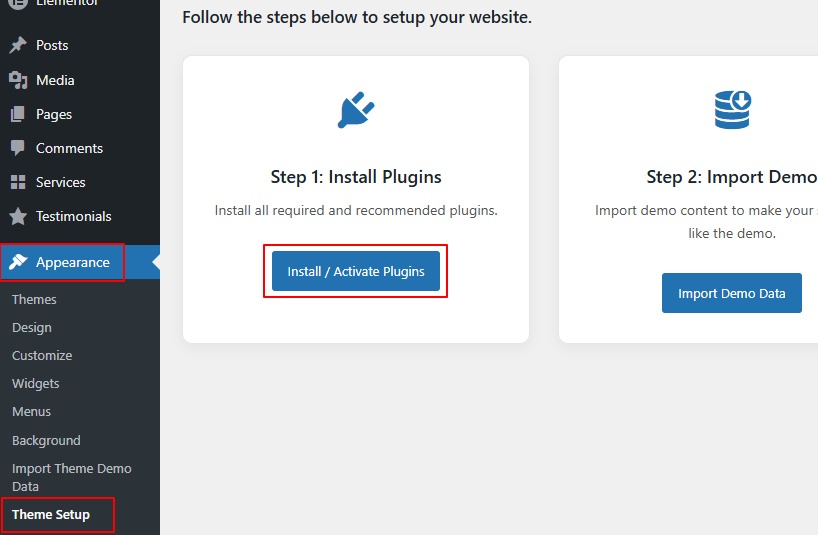Click the Install/Activate Plugins button in the Theme Setup wizard.