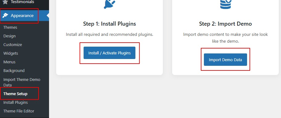 * Alternatively, you can run the setup wizard from Appearance → Theme Setup in the WordPress admin menu.