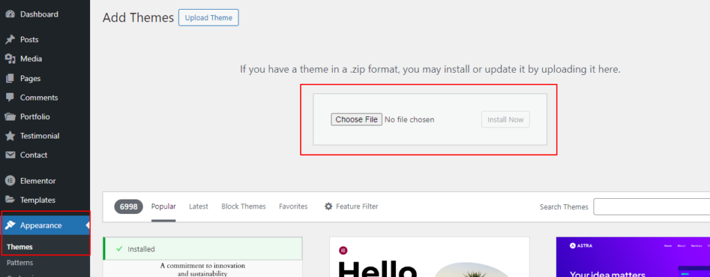 - Select the updated theme .zip file and click Install Now.